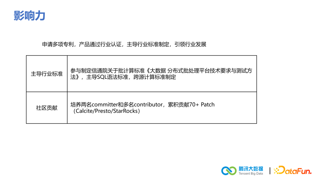 在影响力方面,我们参与了一些行业主导标准制定。在社区方面我们培养了两名的 committer 和多名 contributor,累计其实贡献了 70 多个 patch。