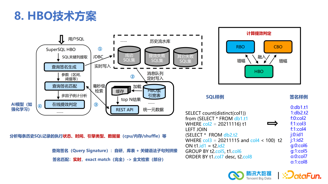 SuperSQL 在执行 SQL 语句时实时生成 HBO 查询签名,其为 SQL 文本的“浓缩”表示,包含 SQL 访问的库表名和关键子句中包含的列名,通过查询签名来匹配判断当前用户 SQL 与哪些历史 SQL 等价。SuperSQL 获取这个等价历史 SQL 集后,提取汇总它们的执行特征并融合 RBO/CBO 输出,使用统计分析、机器学习等方法决策当前 SQL 是否应选某类引擎执行。HBO 增强补充(非取代)已有的具体化 RBO/CBO 策略。