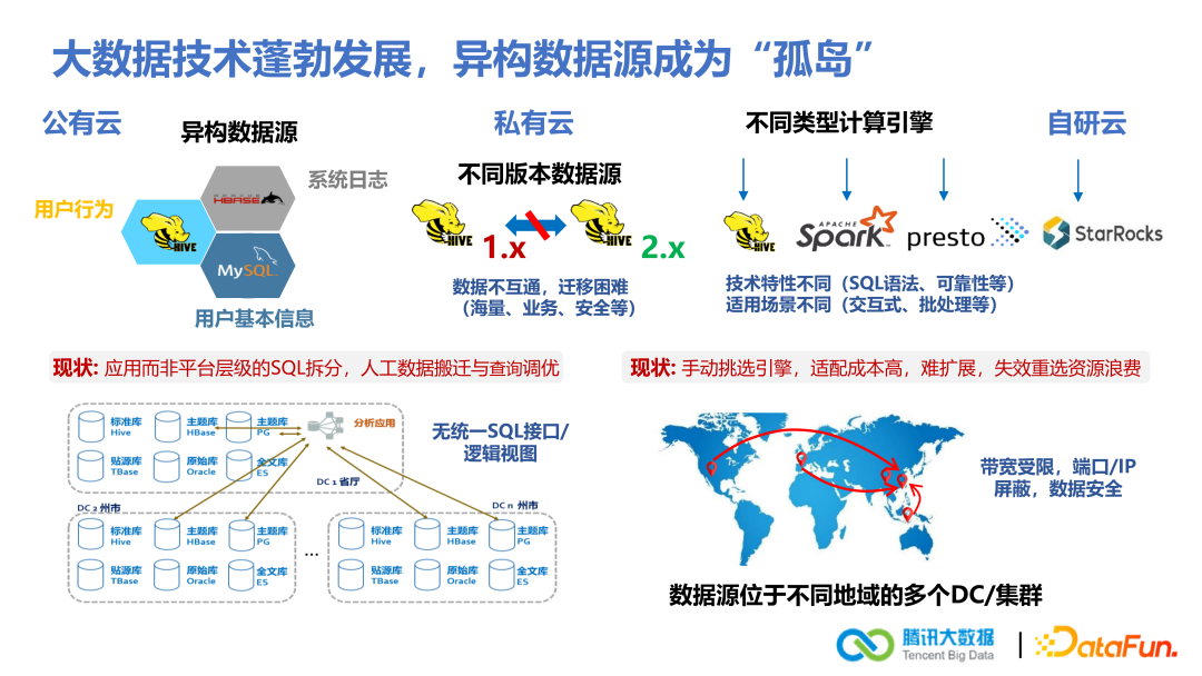首先,因历史原因,不同业务部署到不同的数据库(如 Hive、MySQL 等)上,异构数据源逐渐成为各公司数据孤岛形成的原因。其次公司内不同的数据中心有不同的集群,会存在不同版本的数据源。因为业务的发展,数据中心会部署很多不同的大数据处理引擎,但每个引擎适用的业务场景和技术特性不一样,这导致只能人工做数据搬迁和查询调优,数据安全和效率都难以保证。另外,不同的大数据引擎语法不一样,这导致切换引擎的成本升高,会造成一定的资源浪费。