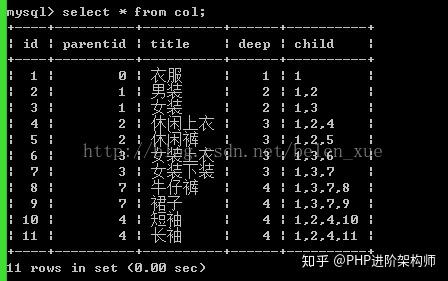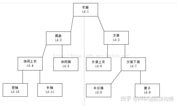 例如一个裙子的类目,它有父类别女装,女装又属于衣服的类目,假定裙子的id为3,女装为2,衣服为1,那么裙子的parentid就是直接的上级类目裙子的id,因此parentid=2,而child是裙子所在的树形结构上全部的祖先元素id,那么child应该是1,2,3,因此裙子的深度deep为3,这里我假设的是用,隔开,也可以用其他的符号隔开,title不用说就是裙子。