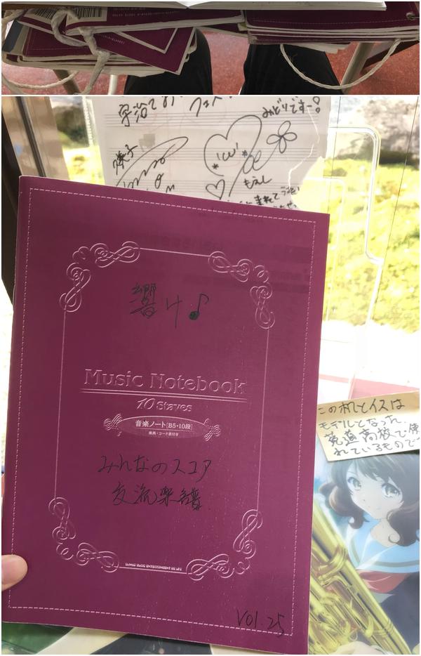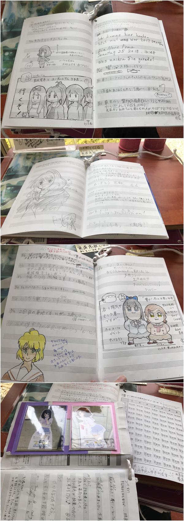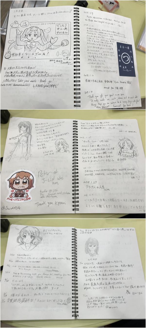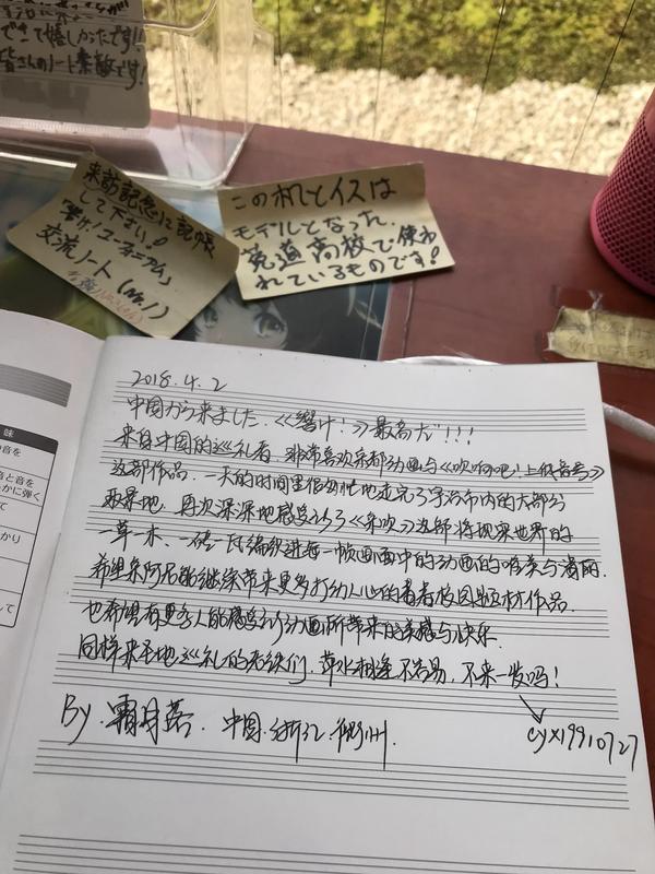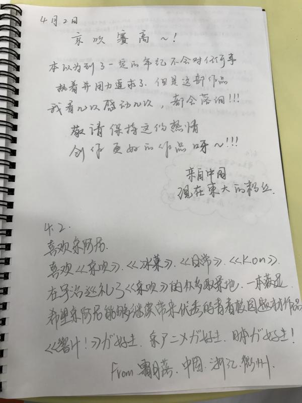 商店的圆桌上摆着熟悉的留言簿,比起游客中心里的京吹主题留言簿,这里中文的比例大幅度增加,野生大触的各种速写也是争奇斗艳。从一页页情怀满满的“感谢京阿尼”的共鸣中,可以感受到那个洋溢着青春气息的京阿尼给所有人带来的温暖与感动:
