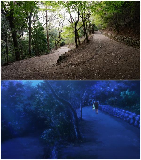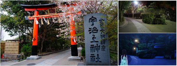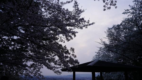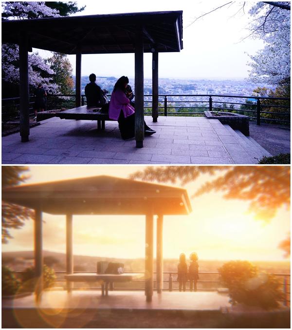 比起动画中的盛夏,四月初的山顶仍夹带着些许微凉,随着华灯初上,夜色下的宇治在夜樱的枝杈间缓缓铺开: