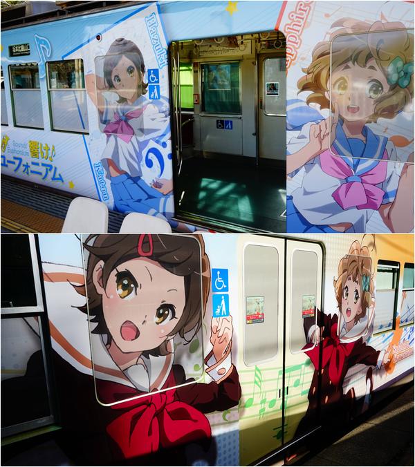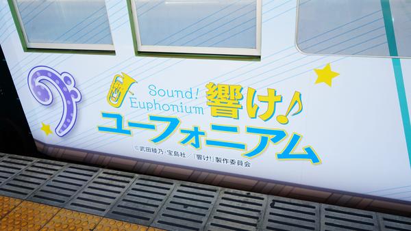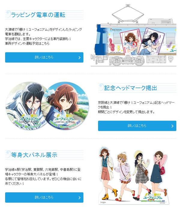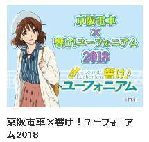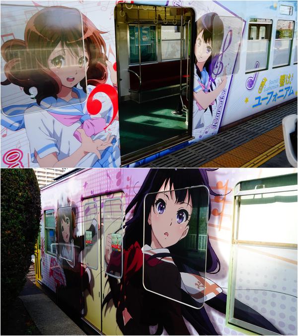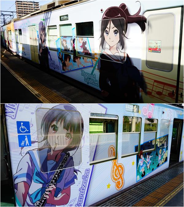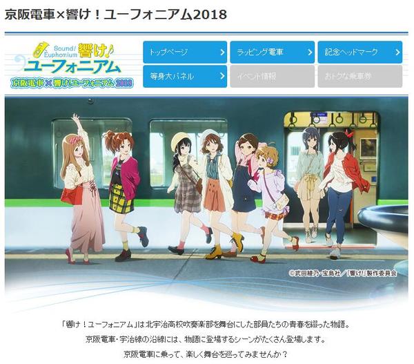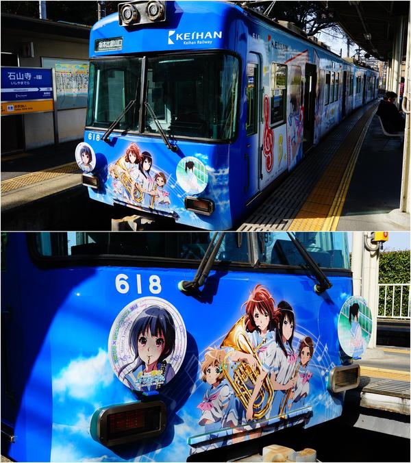 京阪电车之前就与京都动画开展过数次《吹响吧!上低音号》的联动,这次事先在官网上查到了2018的联动专题,主要内容有 主题列车、纪念贴纸和等身大展板 。其中主题列车往返于大津市的石山坂本线,纪念贴纸贴在石山坂本线和宇治线的一部分列车车头,而等身大展板则位于宇治线的4个车站内。