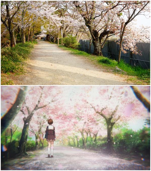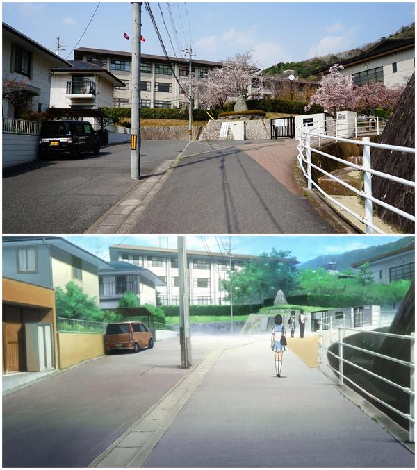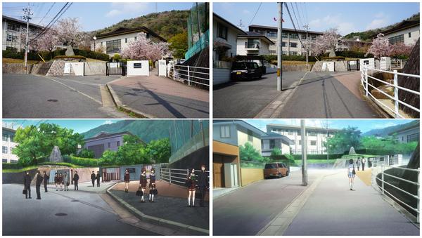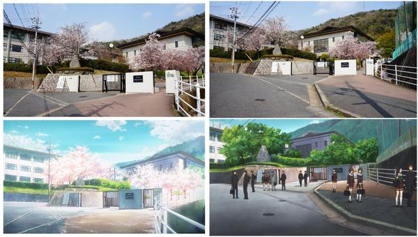 和动画中校门、电线杆、教学楼、樱花树的位置都一模一样: