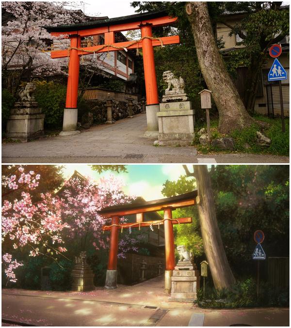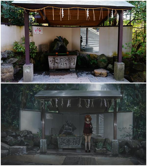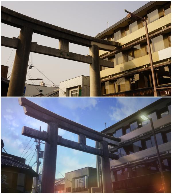 动画中,宇治川东岸的宇治神社出场频率并不高。第一集里泷升的第一次出场是在神社里: