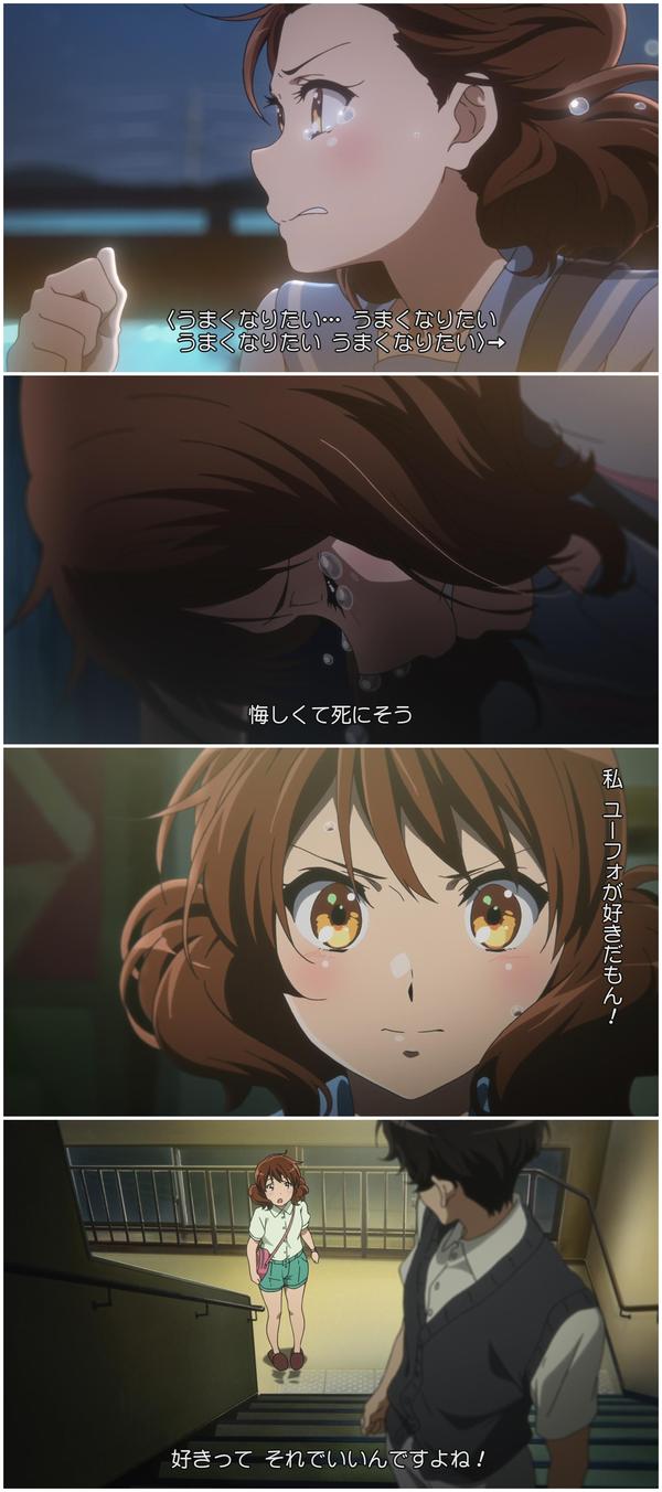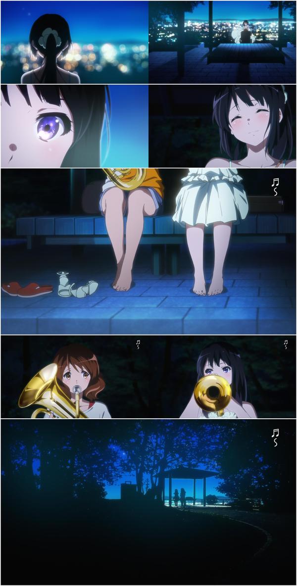第12集中,被排除在演奏之外的久美子带着眼角的泪花飞奔过宇治桥,当梗咽着向夜空高喊“うまくなりたい”时,她终于理解了当初的丽奈咬着牙说出“悔しくって死にそう”时的那份不甘。回家后,面对姐姐“你又不上音乐大学,一直待在吹奏部又有什么意义”的质问,心绪未平的久美子脱口而出了自己都意想不到的答案——因为我喜欢上低音号。