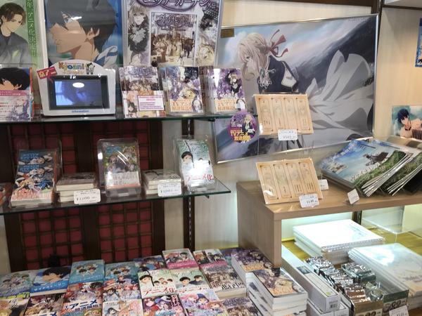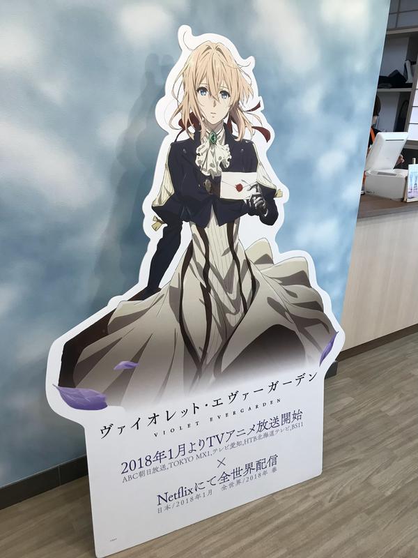正在放送的1月番《紫罗兰永恒花园》的宣传看板。说句题外话,京紫是京阿尼的作品中我看过的最无聊的一部,不是难看,只是单纯无聊地让人昏昏欲睡,简直无法想象这和令人笑岔气的《日常》是出自同一家公司之手。