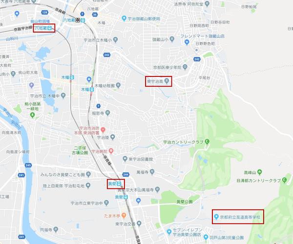 因此有人认为, “北宇治高等学校”虽然是以菟道高校为设定原型,但是在动画中所处的位置应该在现实中“东宇治高等学校”附近 ,从地图上的距离来看,这样的解释无疑要合理很多。