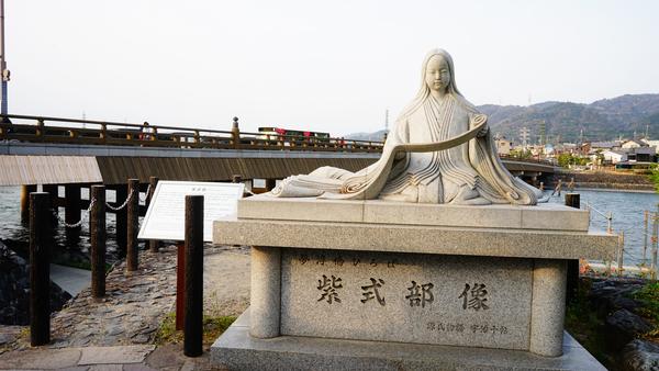 桥西侧的紫式部像,宇治的标志性景观之一:
