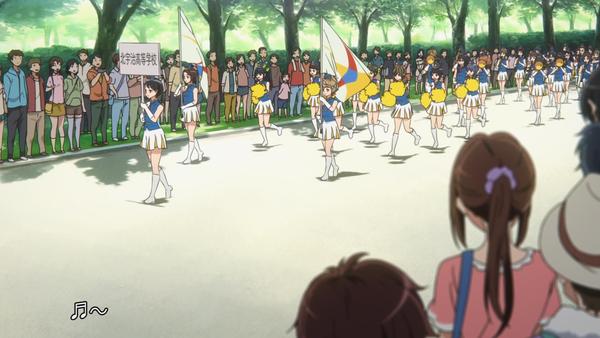 第五集中,北宇治吹奏部参加了京都府各所学校集体参加的固定活动Sunrise Festival,这段边行进边演奏的花式表演配上养眼的制服,构成了第一季的第一个小高潮。