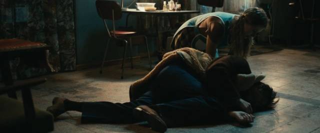 转场,跟着镜头,雅努什从家到来警局。中间紧凑,带有节奏的爵士鼓配乐,让人瞬间联想到J·K·西蒙斯的那部[爆裂鼓手]和冈萨德斯的[鸟人]。或许是导演在模仿致敬[鸟人],轻快爵士鼓点为影片营造了诙谐、极致黑色幽默的气氛。