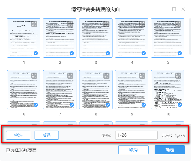 如果文档中有多个页面的,还可以 自定义选择需要转换的页面,勾选页面的缩略图或是直接输入需要转换的页码都是可以滴~