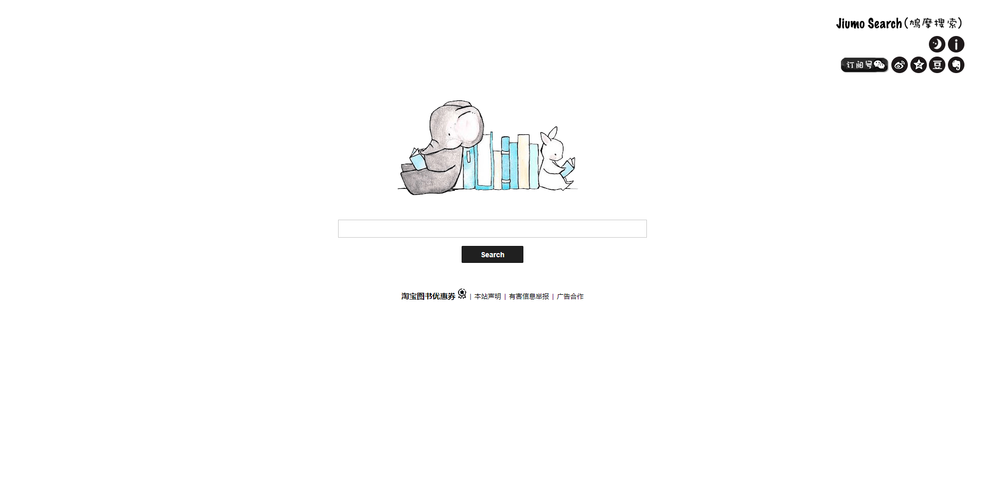 鸠摩搜书网站画面非常简洁,只有一个 可爱的小象 和 搜索框 ,它是提供免费电子书下载的网络平台,提供了大量的电子书资源,包括小说、散文、历史、哲学等多种类型,支持下载PDF、TXT、MOBI等格式。