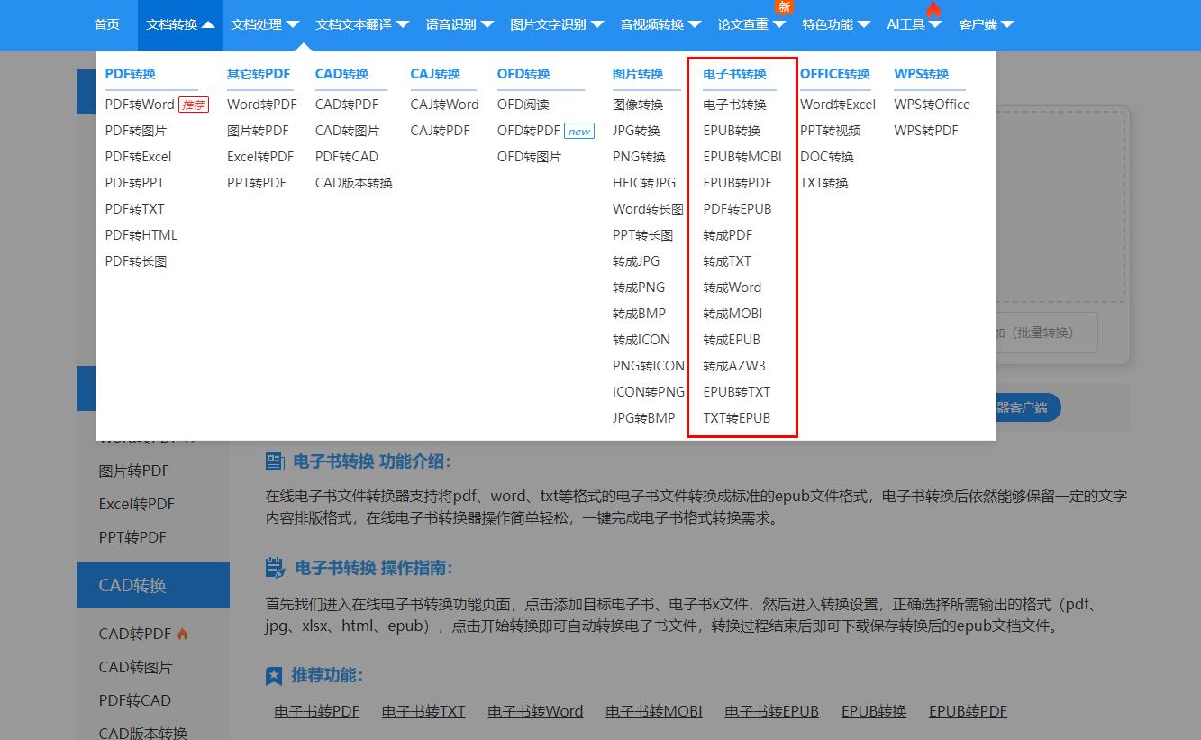 - 网站页面十分简洁,无需注册登录,在线即可使用,有专门的电子书转换格式区域,支持: EPUB转PDF/TXT/MOBI/AZW3等等;