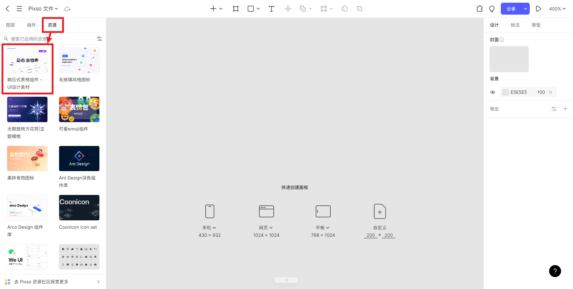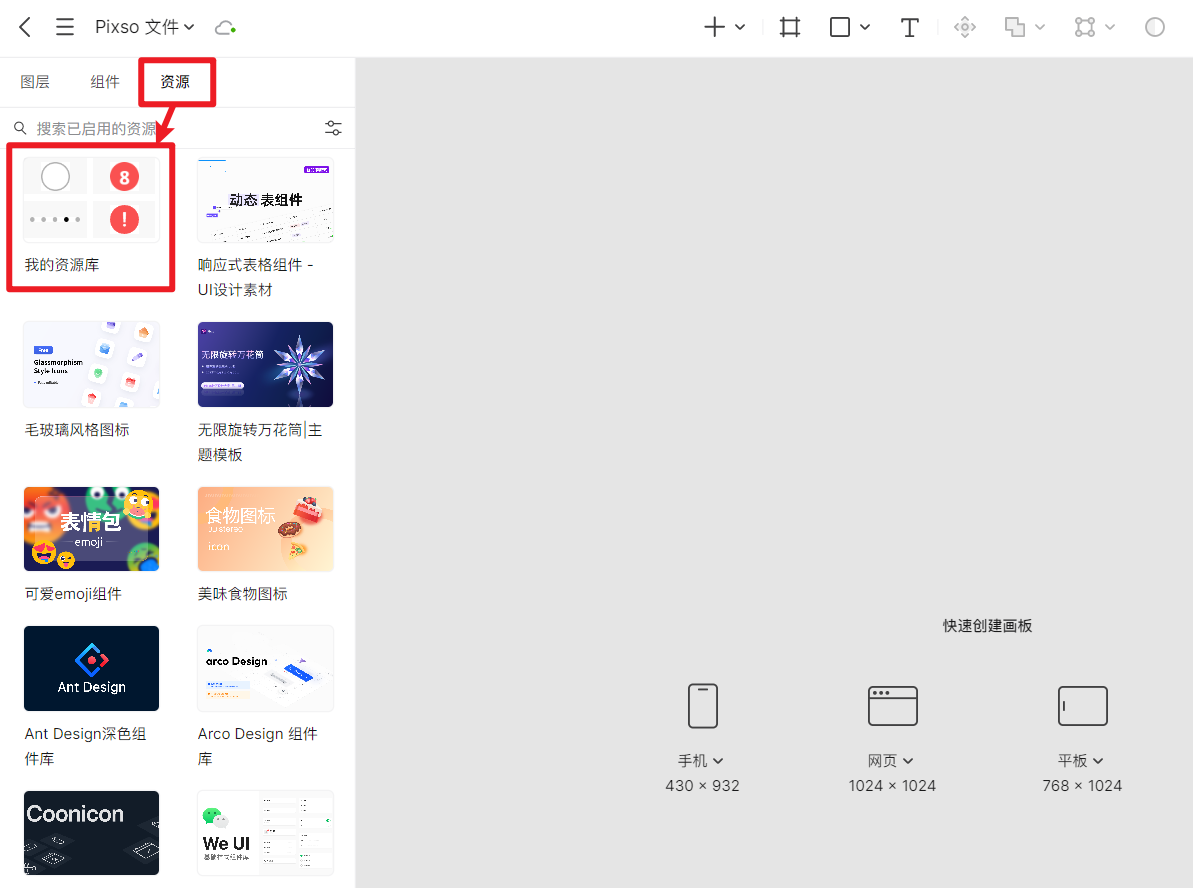 打开刚创建的 Pixso 文件,点击左侧的「资源」选项卡,在资源面板的顶部,就能看到刚从 Pixso 资源社区调用的整个组件库。