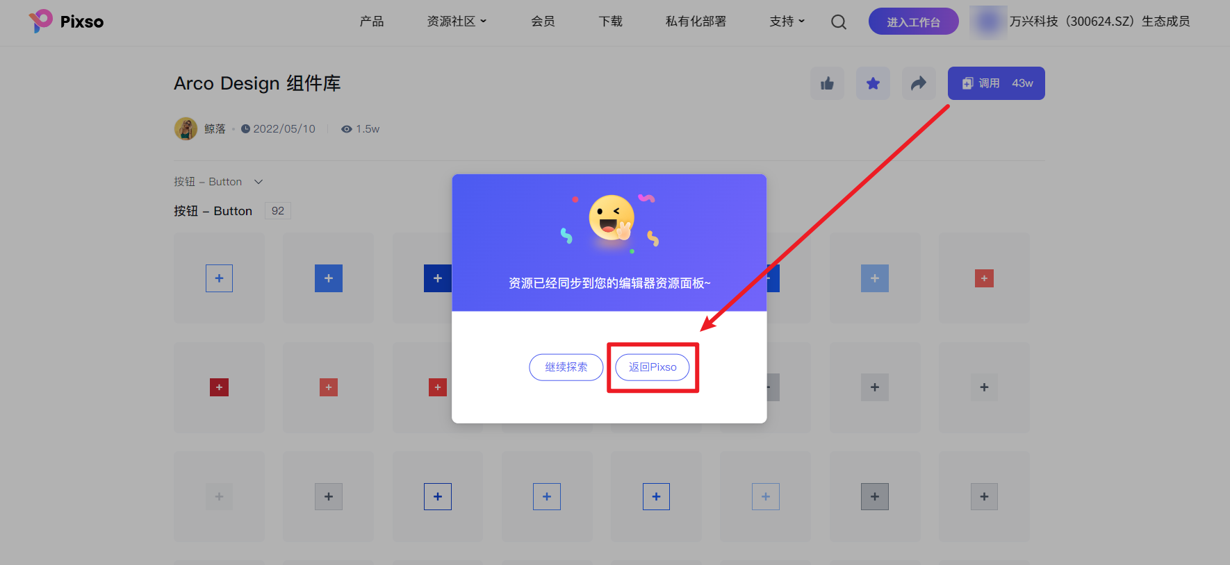 点击组件库右上角的「调用」按钮,所有组件资源会自动同步到 Pixso 编辑器的资源面板,点击面板的「返回Pixso」,就能 在线使用 Pixso 编辑刚保存的组件 。