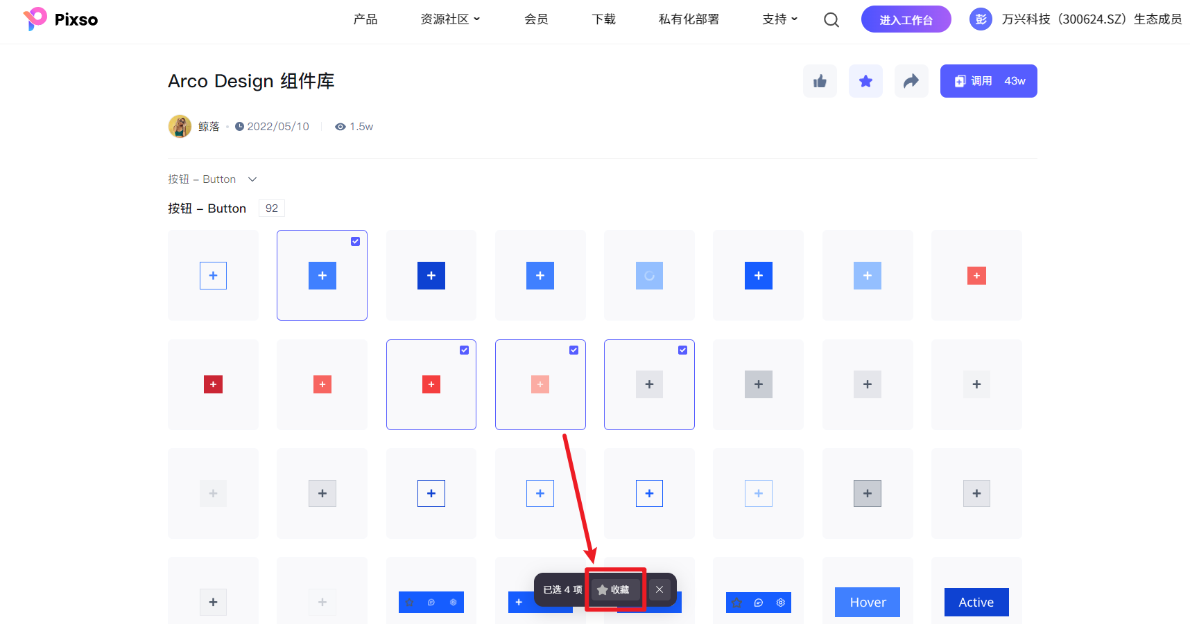 在使用 Pixso 资源社区的组件库时,如果你想使用组件库中的全部组件,可以点击右上角的「 调用 」,将组件库一键保存到自己的账号中,如果只需要用到其中的部分组件,可以勾选对应组件右上角的复选框,接着点击底部的「 收藏 」,将组件保存到 个人资源库 中。