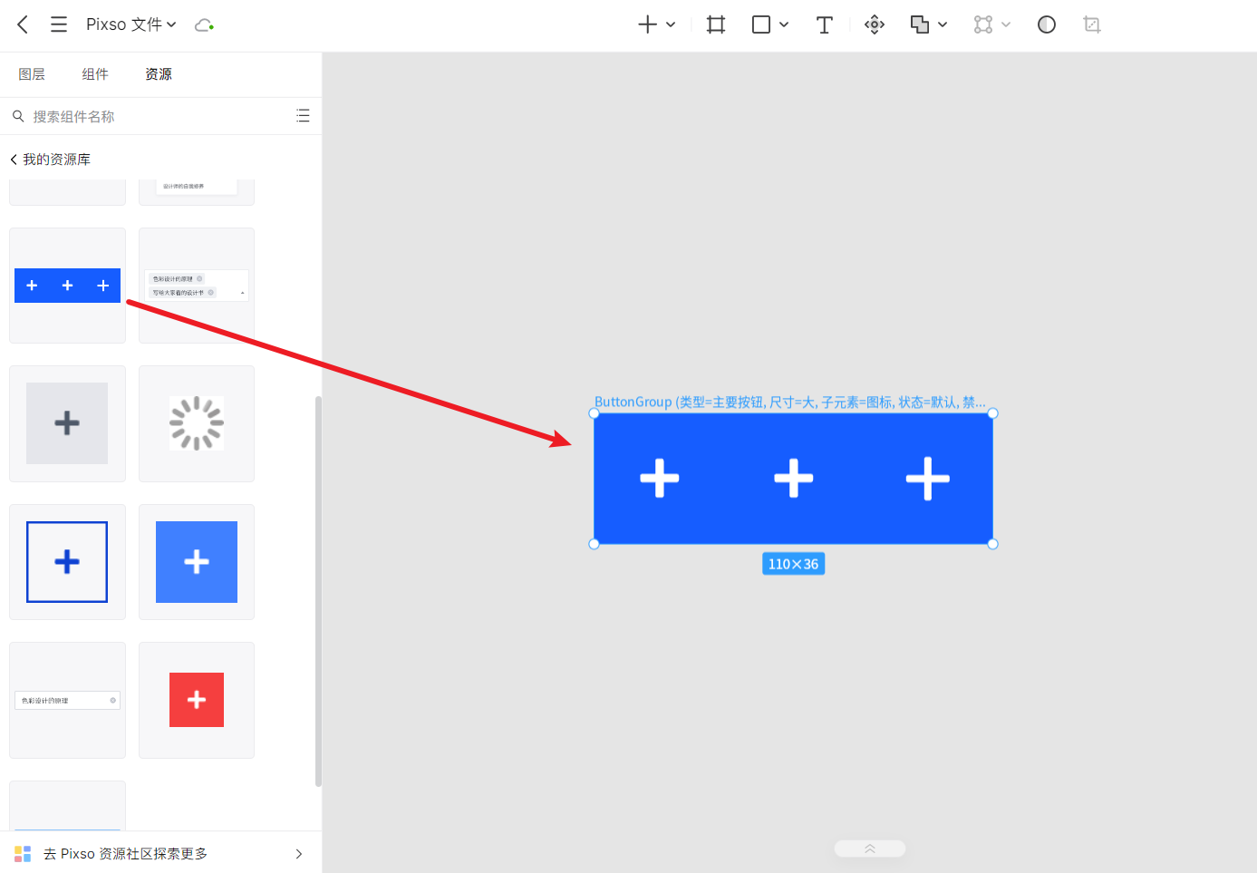 点击资源面板中的「我的资源库」,进入资源库的二级页面,就能看到刚从 Pixso 资源社区组件库保存的一个或多个组件,将组件拖拽到中间的编辑区域,就能在项目中使用组件啦~