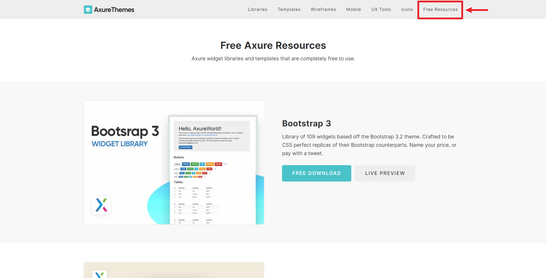 点击网站顶部工具栏的 Free Resources,进入网站的免费资源页面,在这个页面就能看到 多个免费可商用的 Axure 元件库和模板 ,例如 Bootstrap 3、Bureau UI Kit、Flowchart Cards、Agency Template、Personas、Clean Blog、Linear 4 Page Template。