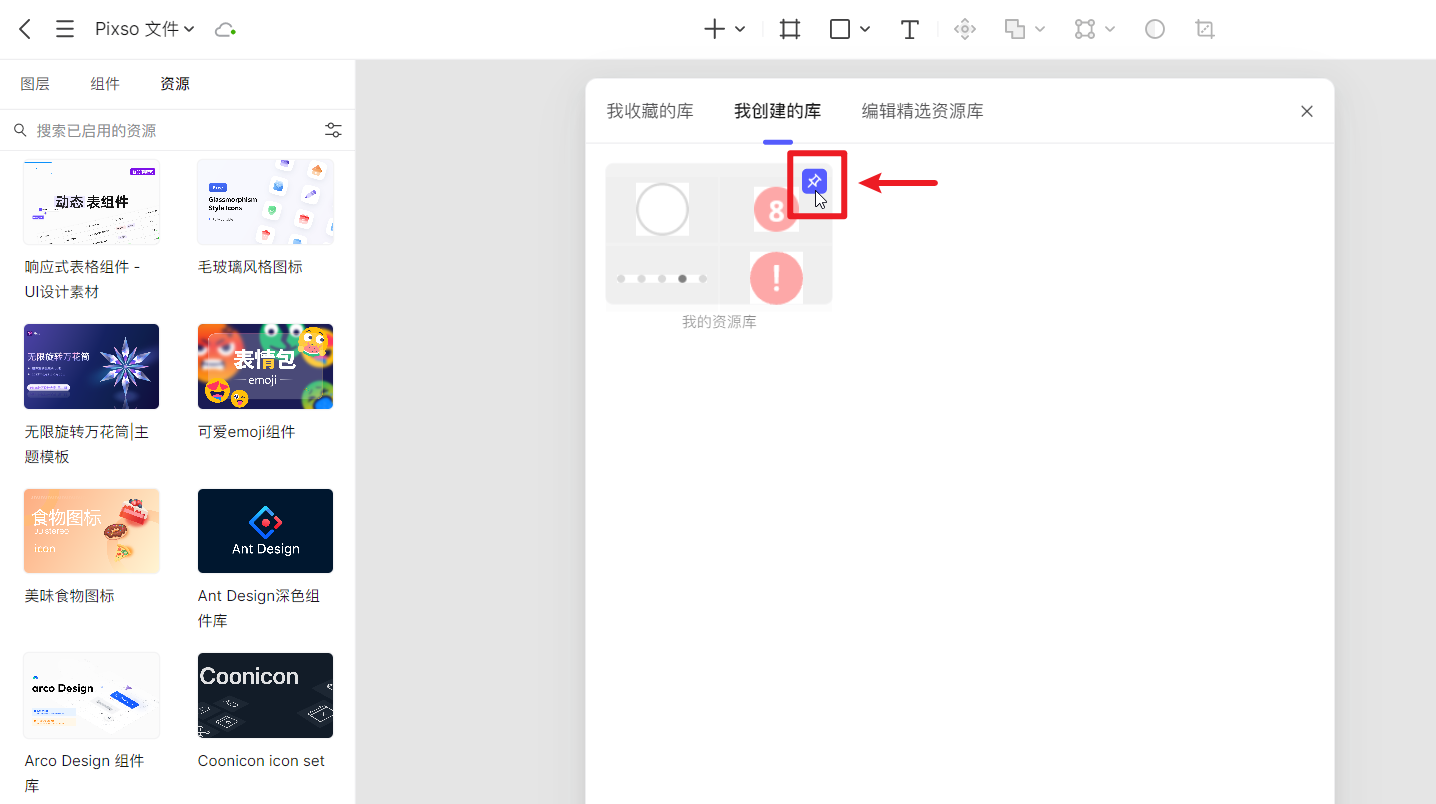 将鼠标指针移动到「 我的资源库 」上方,点击右上角的「 固定 」按钮,将个人资源库添加到左侧的资源面板中。