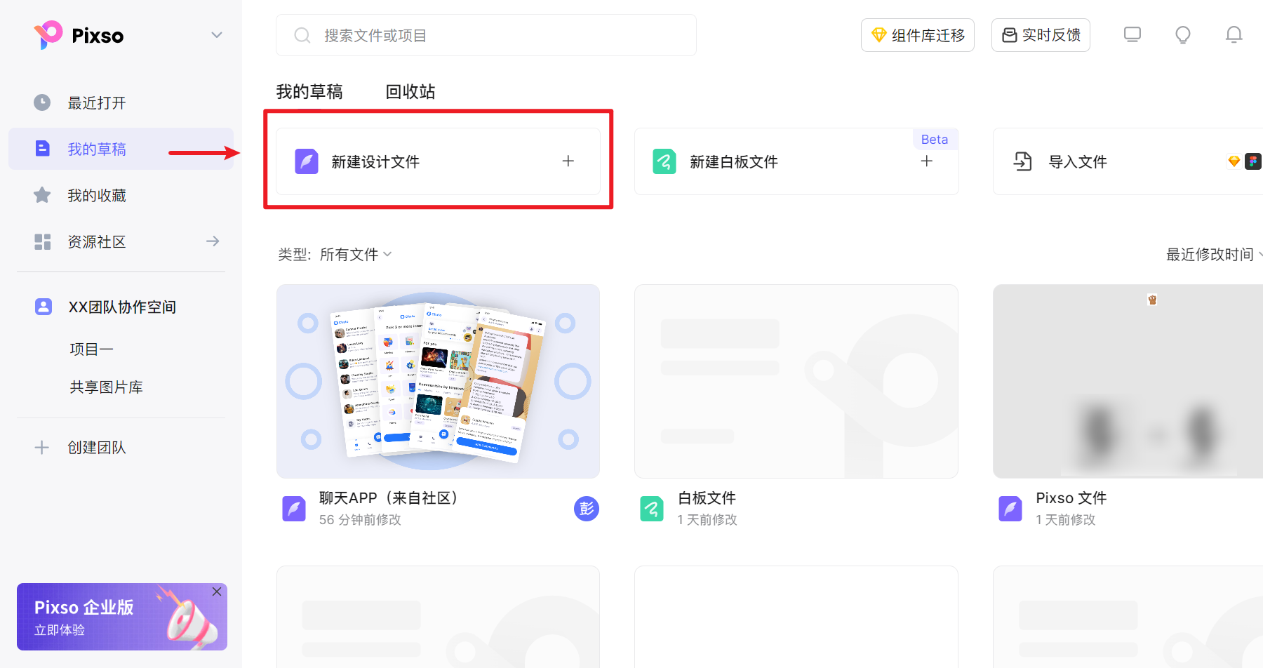 点击上方的返回按钮,会在新标签页中打开 Pixso 工作台,点击工作台左上角的「 新建设计文件 」,创建一个新的 Pixso 设计文件。
