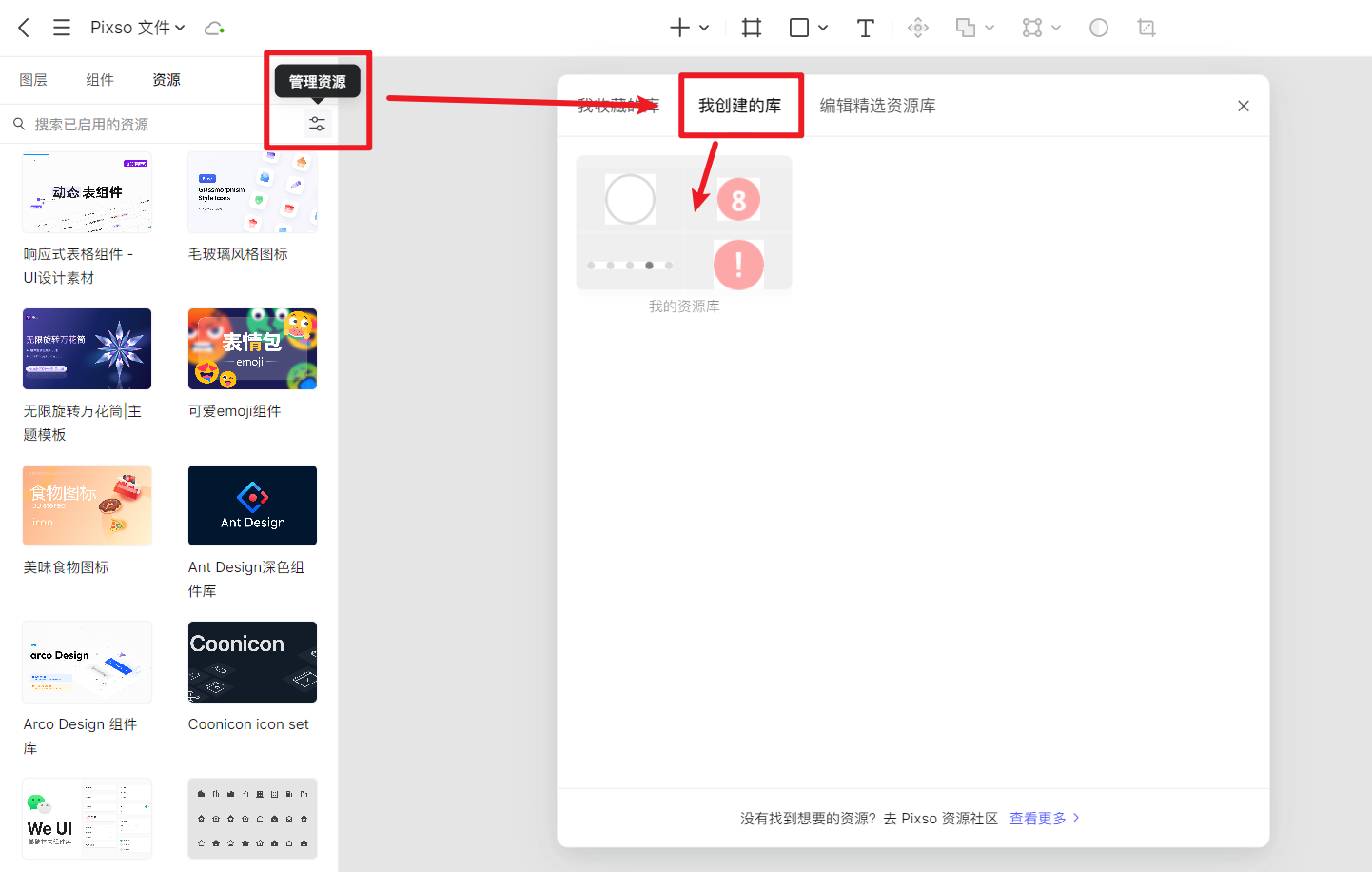 而如果想查看我们从组件库中 收藏的部分组件 ,则要点击资源面板右上角的「管理资源」,在弹出的面板,切换到「我创建的库」,就能看到保存我们收藏的组件的资源库。