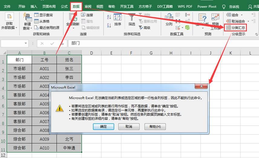 1.选中A1:C11单元格区域,在“数据”选项卡下,单击“分类汇总”,会弹出一个提示窗口,如下图所示: