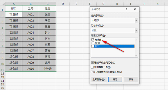 2.单击“确定”,在弹出的“分类汇总”窗口中,勾选要合并的列,即“市场部”,如下图所示: