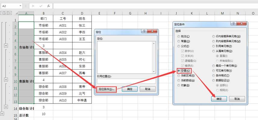 3.选中需要合并的单元格区域,即A2:A13(注意:标题行的A1单元格无需选中),按F5键或CTRL+G弹出“定位”菜单,单击“定位条件”,选择“空值”-“确定”。如下图所示: