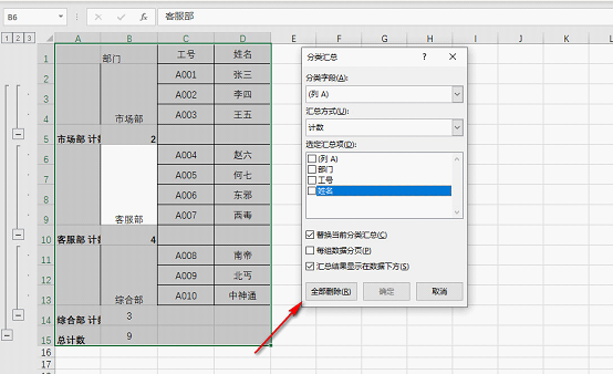 6.选中A1:D15单元格区域,再次点击“分类汇总”。在“选定汇总项”中,不选择任何汇总项,单击“全部删除”,如下图所示: