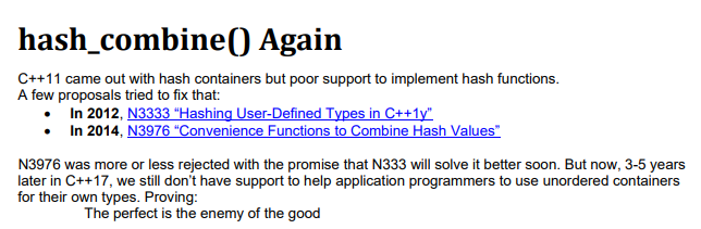 2012年和2014年分别有两个提案, 但2014年的提案被拒了因为他们觉得2012年的方案更好, 但是直到C++17依然没有发布任何相关的代码.