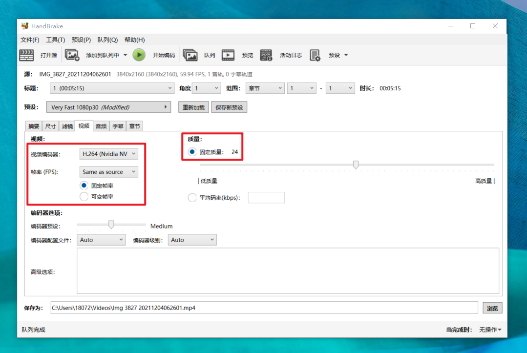 通常压缩视频所需的时间都不短,所以我一般会选择 “ Very Fast 1080p30 ” 这个预设: