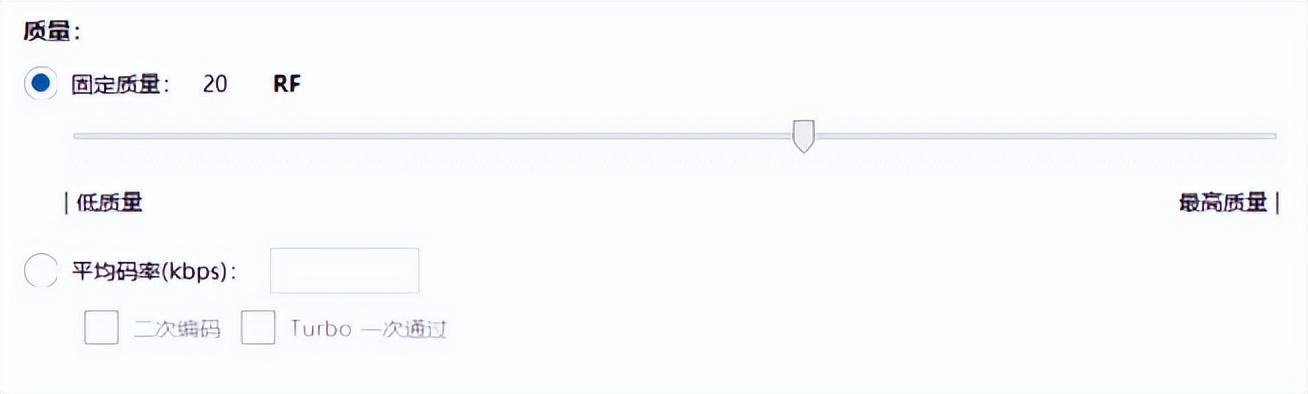 如果你想让压缩完后的视频画质尽可能接近无损,就可以在固定质量这块,把 RF 的数值调小一些,这个数值越小画质越好,但相应的,体积也会更大: