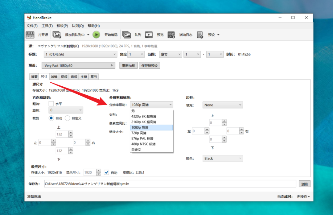 这个预设默认是把视频压缩到 1080p,如果你的视频分辨率并不是 1080p,那就需要在尺寸选项下的分辨率限制里,把分辨率修改下: