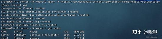 19、加入进来以后,发现主节点和工作节点都没有准备就绪,我们需要借助一个网络插件 flannel,安装好以后它不会马上是准备状态,需要我们等待一下,大概1分钟左右