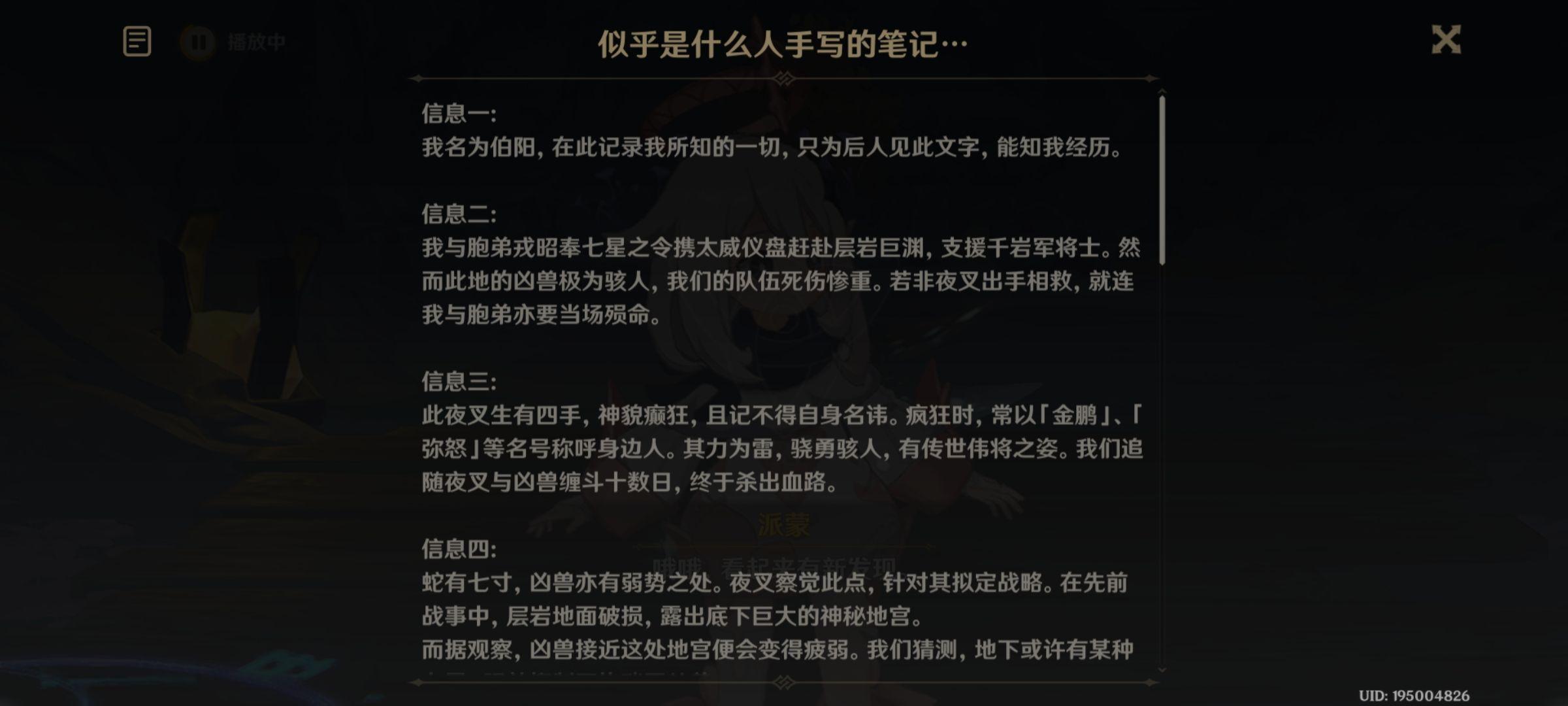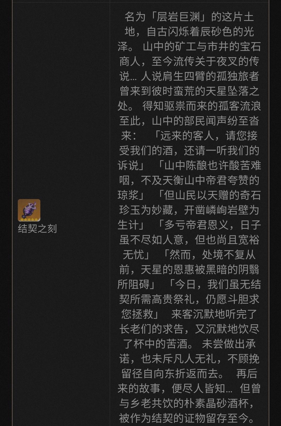 圣遗物套装“千岩牢固”和“辰砂往生录”的背景故事,分别从千岩军视角和浮舍夜叉视角,记录了五百年前的层岩巨渊之战: