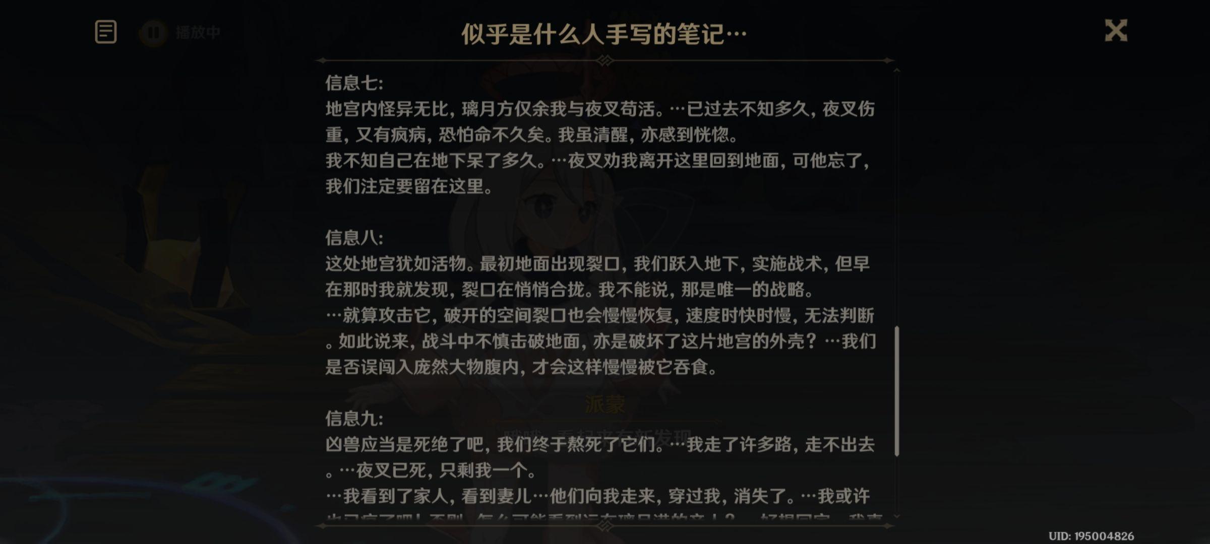 魔物在地宫中被极大地弱化了,即使如此一同被封印的千岩军士兵还是死伤殆尽。地宫对璃月人同样有副作用,会让人感到精神恍惚,伯阳还发现最初地表的裂口会自己合拢。他本可以攻击裂口给自己留条后路,但为了彻底消灭深渊魔物,他愿意让自己和魔物一同葬身地宫。