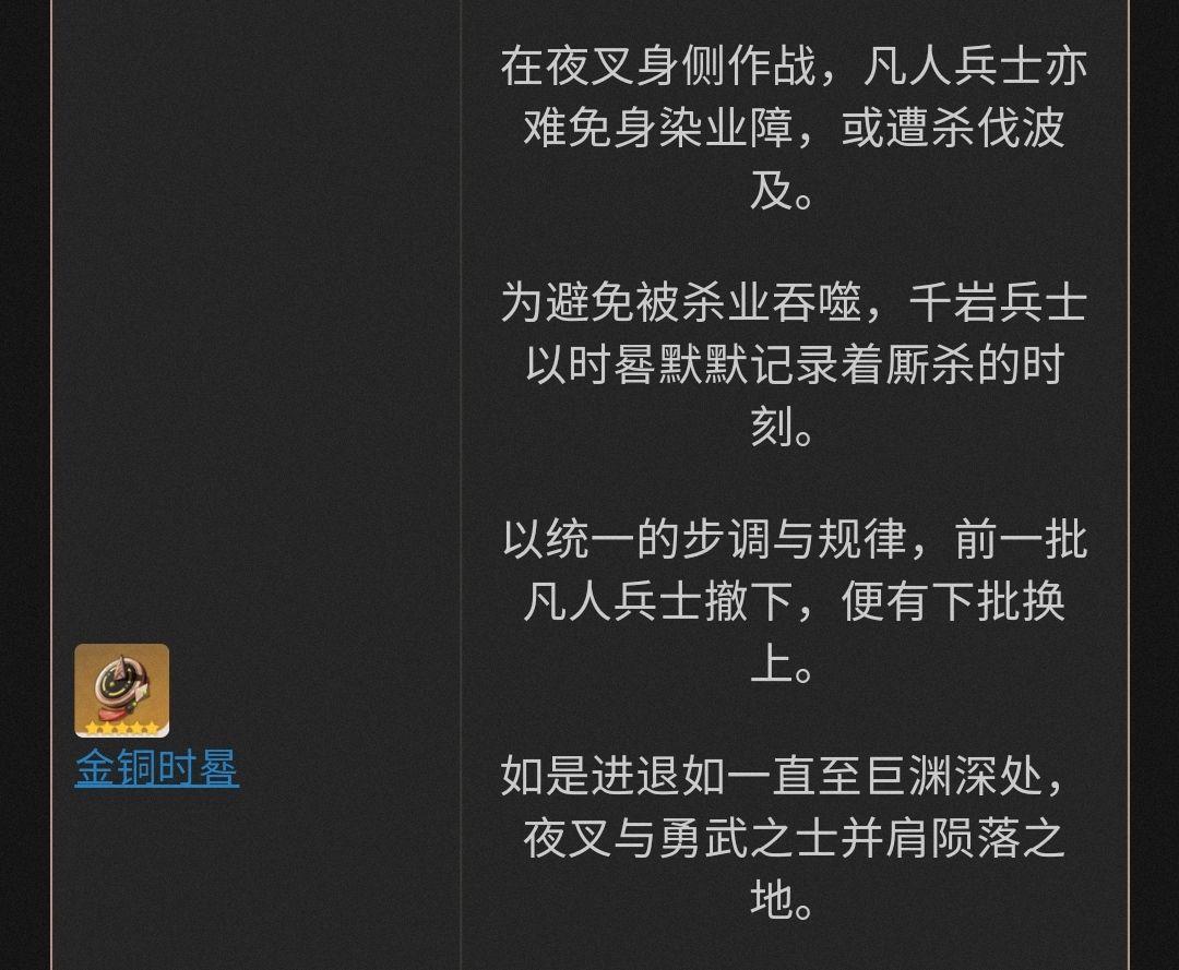当时浮舍夜叉不是孤军作战,还有一支千岩军与他并肩作战。千岩套圣遗物的头装就是统兵将军的头盔,杯子则是这支军队出发前誓师用的酒杯。时之沙则是将军的时计——千岩军结阵与浮舍夜叉并肩作战,但夜叉身上有魔神残渣留下的“业障”,千岩军的凡人士兵们无法长时间待在他身边,于是将军手握时计,让士兵分批按时撤下换人。千岩军士兵训练有素步调一致,使这个战术成功实施,坚持了很久,直到把魔物引到巨渊地下: