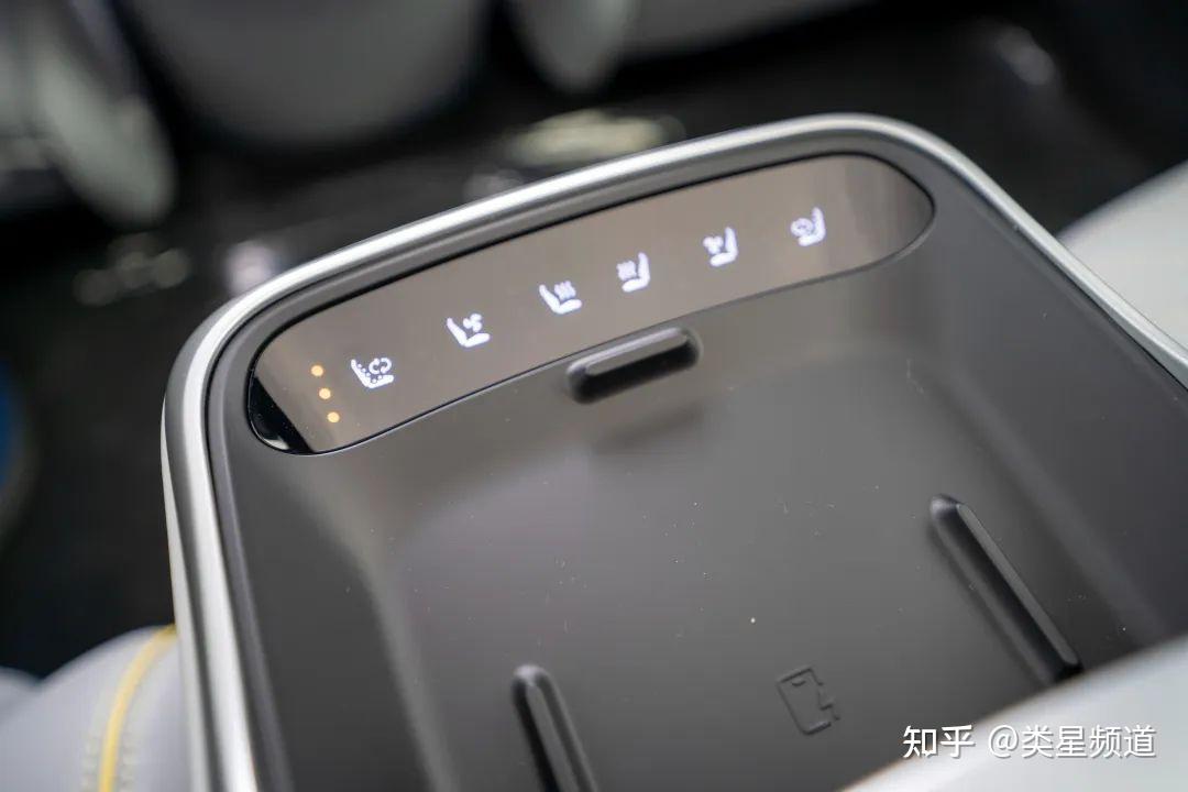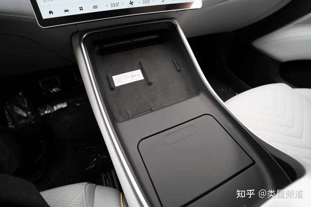 所有的出风口都进行了隐藏式的处理,Vortex 情感涡流的两侧、无线充电板的上方。有点小遗憾是这个 提供通风并且支持 50 W 无线充的充电板只有一个。 扶手箱的开启按键也隐藏到了杯架上方的区域,手套箱则只能通过车机来开启,并且还要进到二级菜单里,有点麻烦,希望下次 OTA 可以优化好。