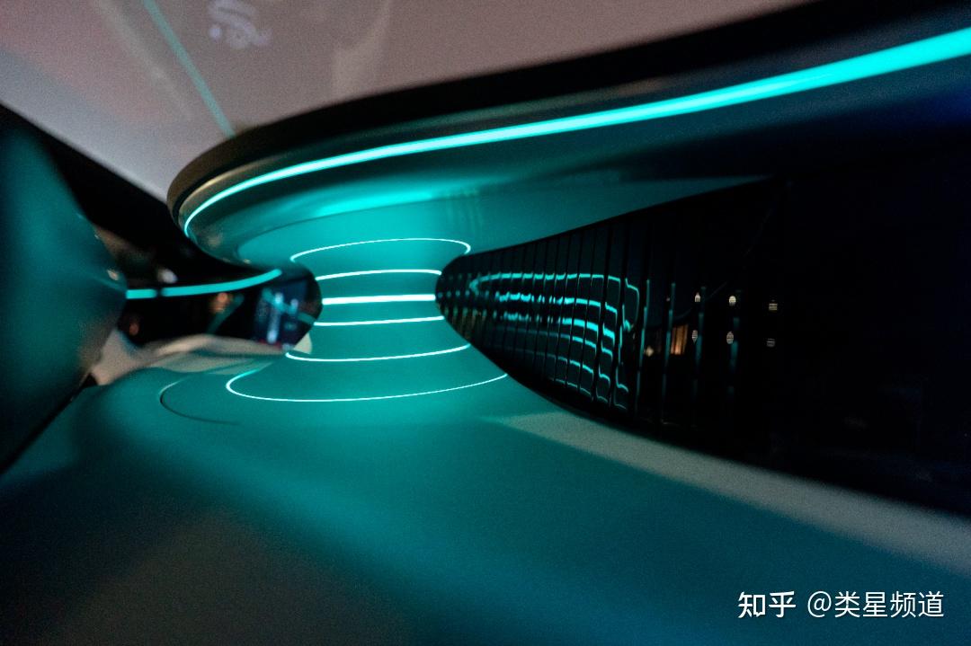 前排通过中间的 Vortex 情感涡流(我也没找到更好的形容词,就用官方的吧),整台车的内饰采用对称设计。这和现在很多配备副驾屏的车型不一样, 由于副驾屏、仪表盘和中控屏在功能和观感上的冲突,很多车型都强化了功能,放弃了观感。