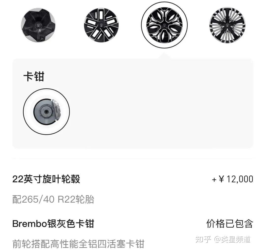最后一个纠结点在于轮毂,标配 21 寸低风阻轮毂,不过样式太丑,2000 块换个多幅轮毂看起来很有必要。 如果再加 1 万元,可以升级成 22 寸轮毂和 Brembo 卡钳。 好看的同时,续航会进一步降低,不过在我这颜值优先级还挺高的。