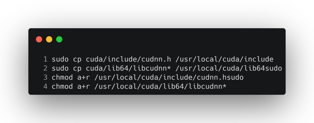 我们知道,下载了cudnn之后需要将里面的文件拷贝到cuda中。所以需要执行以下命令: