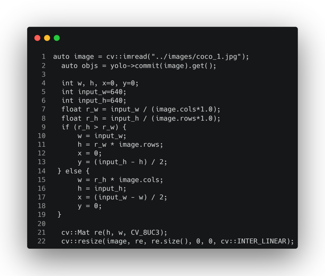 然后就开始读图然后获取结果,注意这里需要根据图片本身的大小以及输入到模型的大小进行一个缩放的过程。