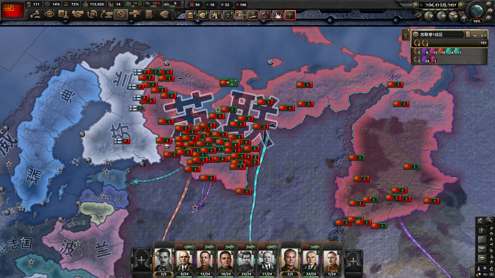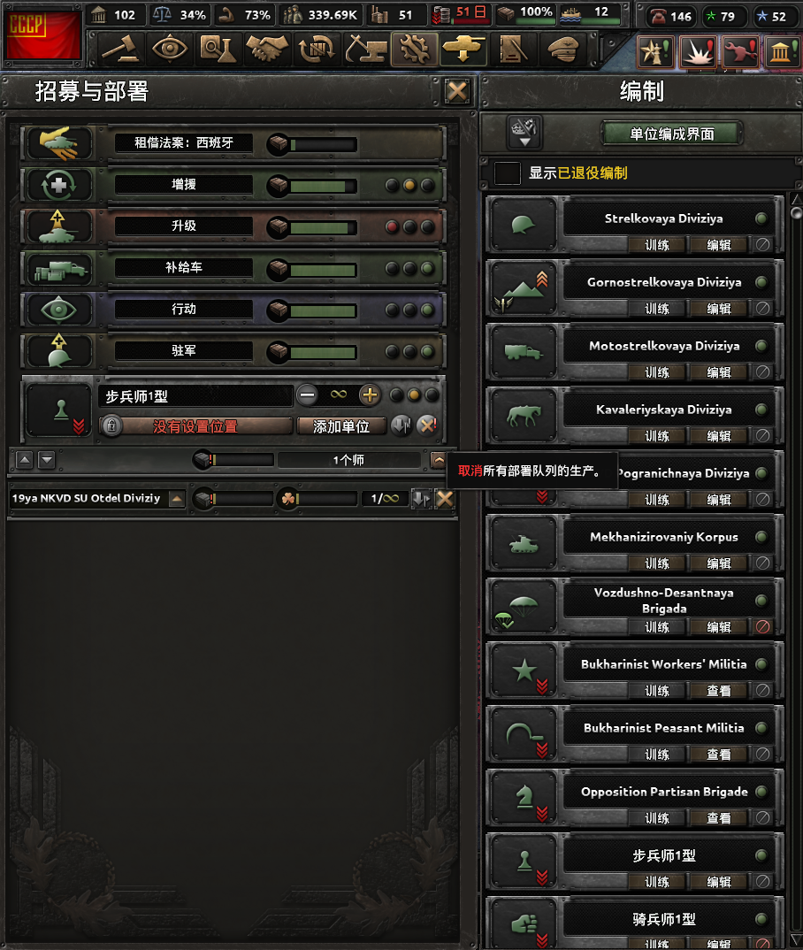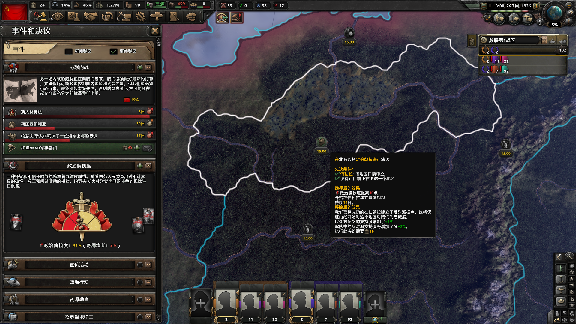 布哈林的内战线,最后删部队,同样可以骗日本宣你,开总动员,吞日本,大概也能和斯大林开局宣土耳其一样,41年能到400厂,关键你有六槽,意味着你可以更多的越级研究科技
