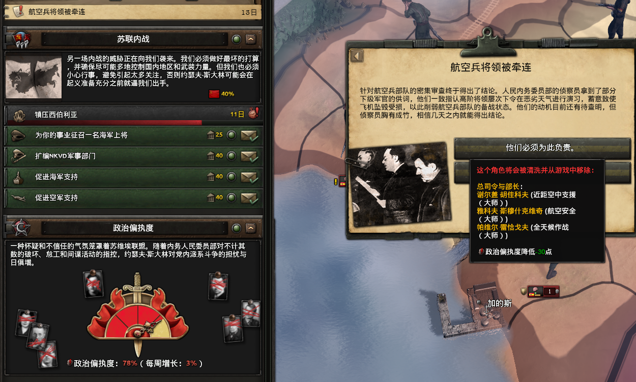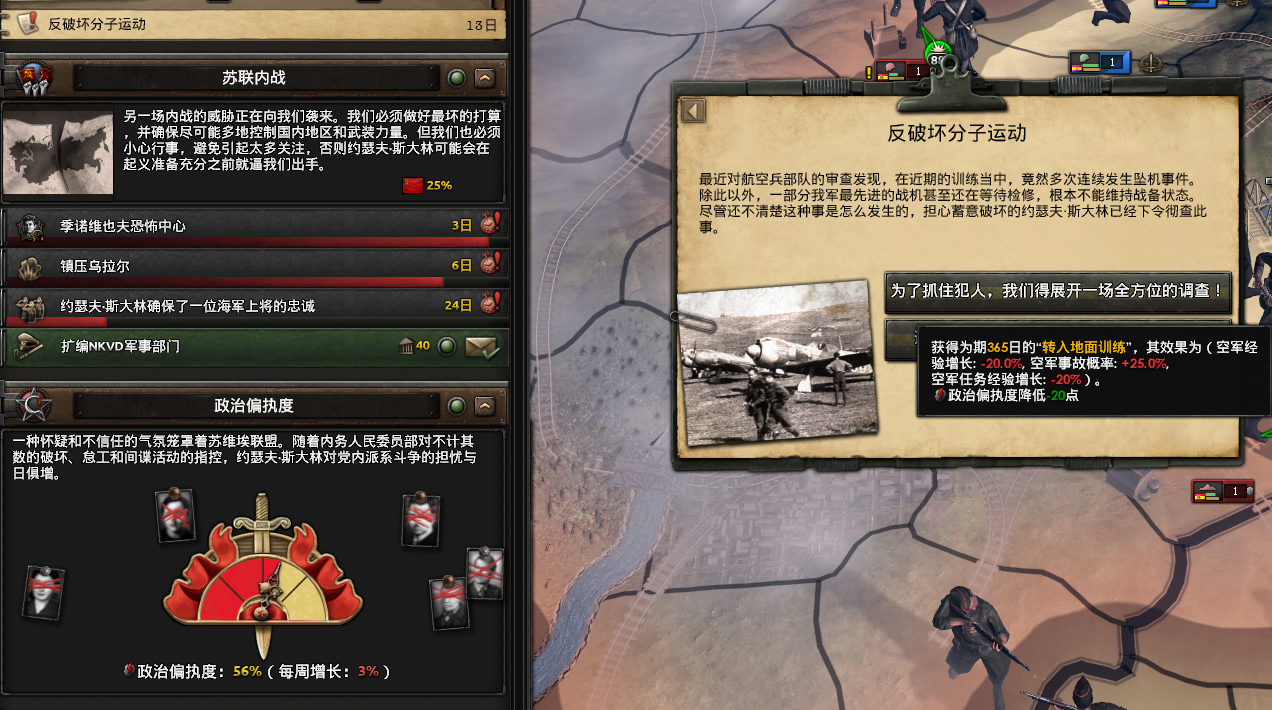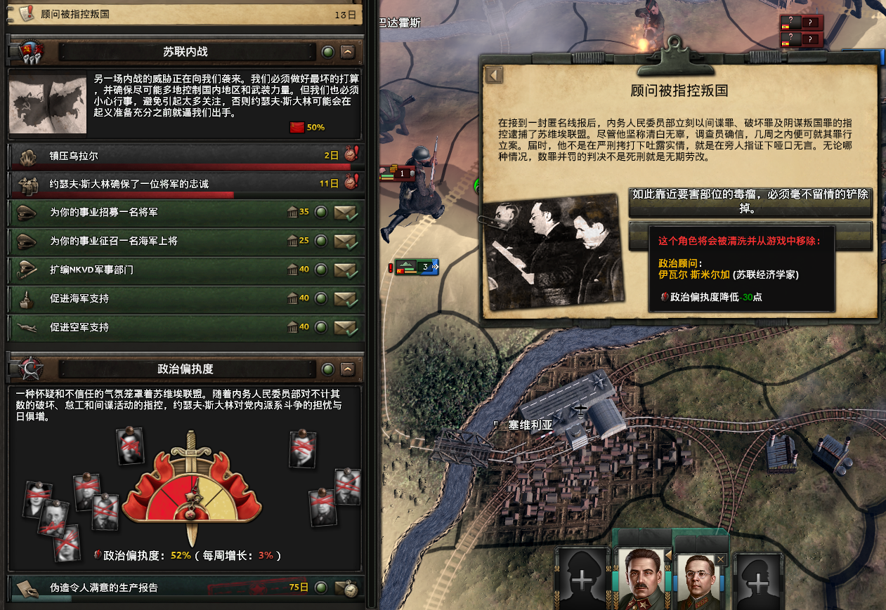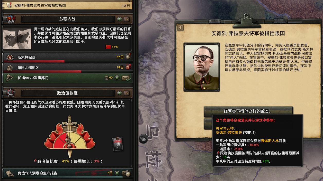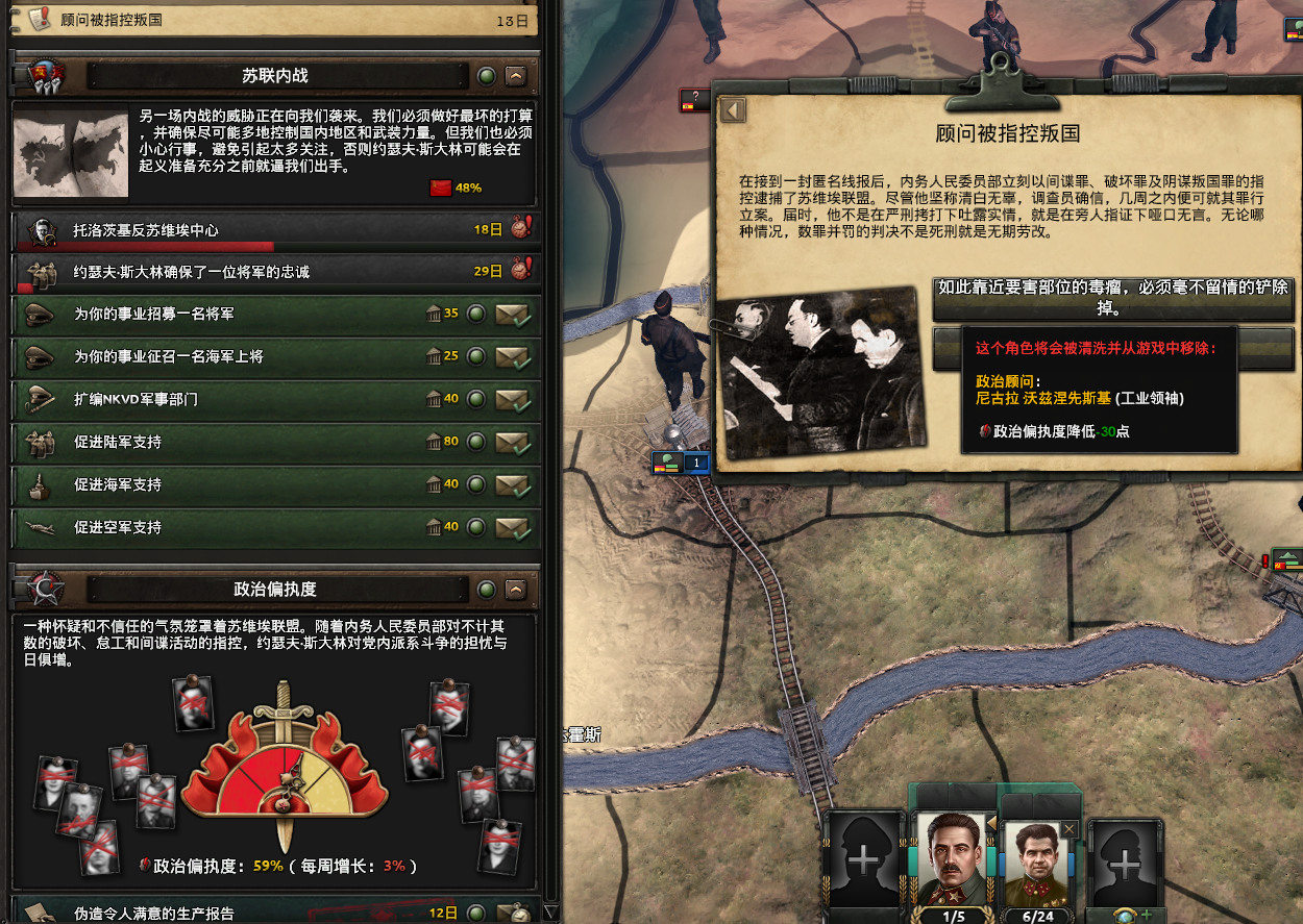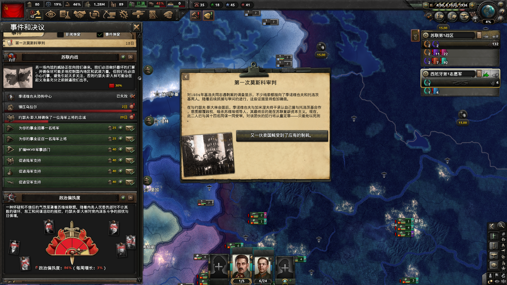 还有,布哈林线的优势,是暗杀斯大林,拿完整的陆海军将领(第一次大清洗只洗内阁,第二次大清洗前暗杀,一个陆海军将都不丢),还有第六槽(全钢铁雄心一共就四个国家有六槽科技,多稀有),布哈林本身带科研速度,科研贼快,你要自己建厂,为什么不玩斯大林,不内战,安心种地是最大收益,这是公识,打个土耳其,来开个总动员是额外收入