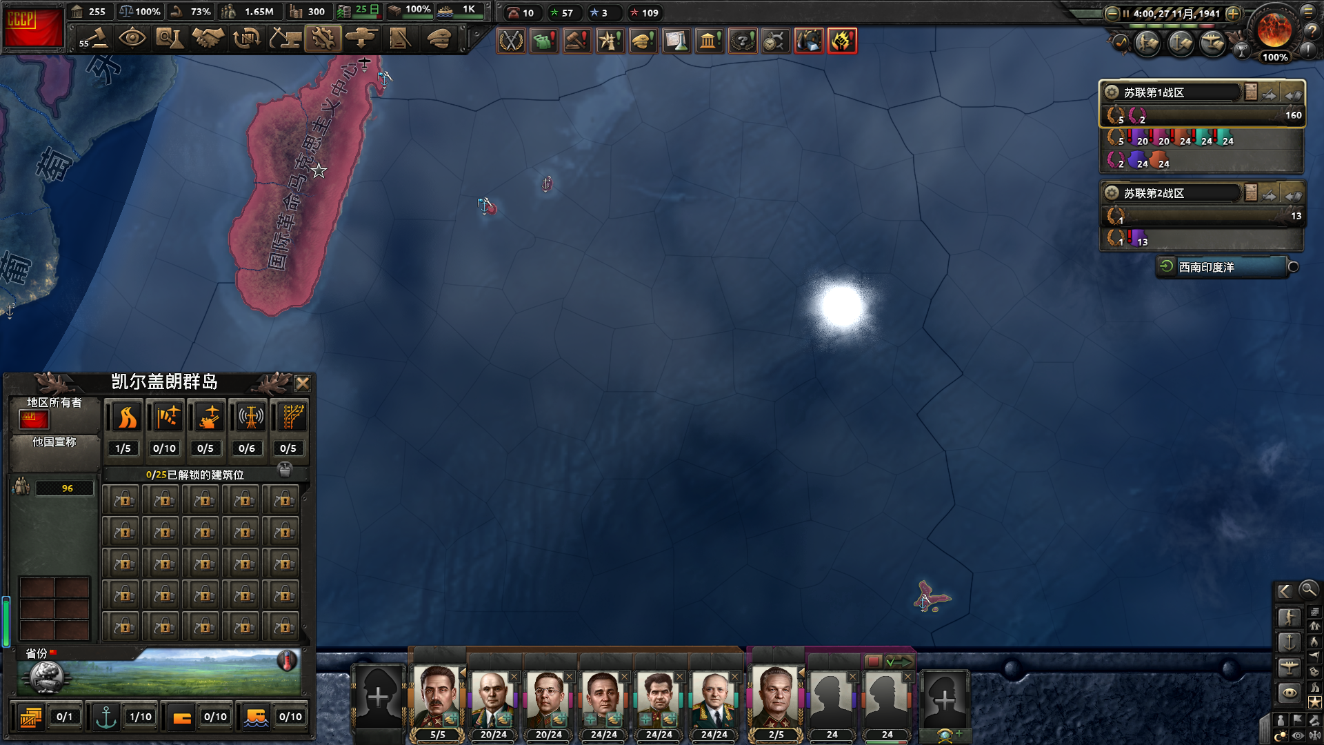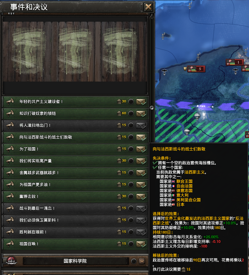 ③通过国策给的对法西斯+20%战斗修正的buff就是强,本来最后105天我是要去点<军事工程学院>的,还好当时下定了决心去试试<根除西方法西斯>的效果,不然就是另一个故事了。
