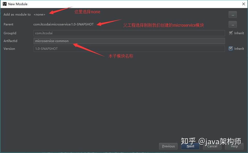接下来我们搭建 maven 子工程中的公共模块 microservice-common,新建子模块,我们要选择 module,步骤为: File -> New -> Module,然后选择 maven,这和上面建立父工程一模一样,下一步的时候需要注意: