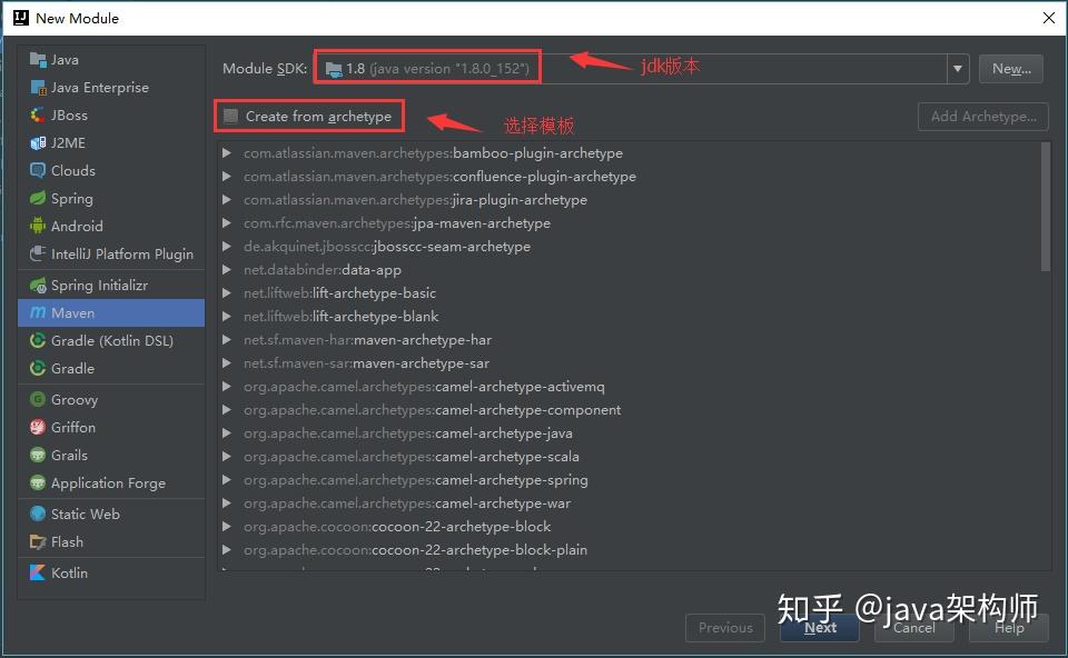 接下来会弹出窗口让我们新建 modules,点击 + 号,新建一个父工程,也就是一个父 module。然后我们选择 maven 工程,选择 jdk 版本和模板,模板也可以不选择,我这里就没有选择,自己搭建即可。