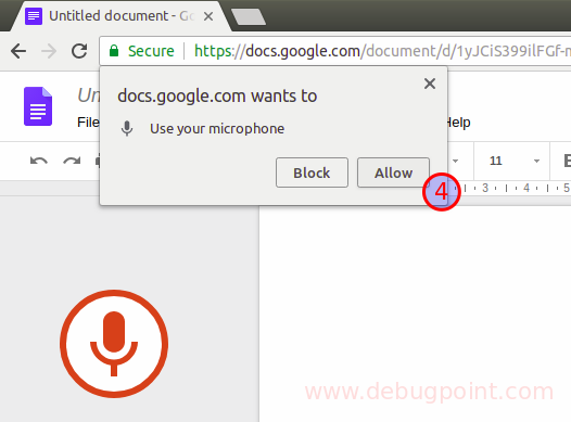 在左侧,你可以看到一个麦克风图标。单击麦克风图标,Chrome 会首次要求允许通过浏览器访问麦克风。单击允许。