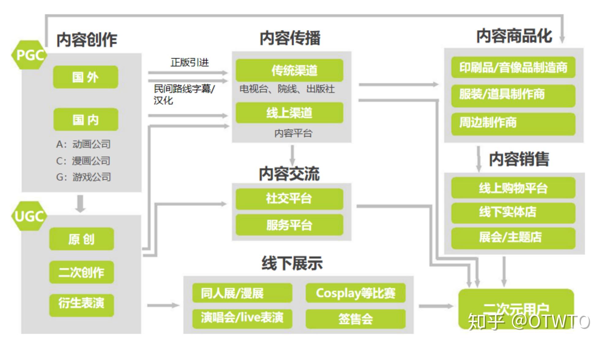 二次元行业基于二次元内容的产出,主要可分为PGC与UGC两条路径,衍生出内容传播,内容交流,内容商品化,内容销售和线下展示的商业模式。